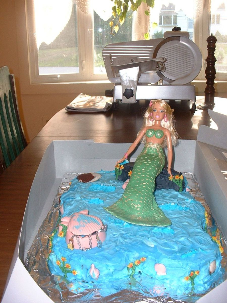 This is a 1/2 Chocolate 1/2 Yellow cake with buttercream frosting. My Niece wanted a barbie doll, so I took the clothes off, used colored fondant and shaped tale, used a straw to make scales and gold dust to add shine, also added fondant and shaped as shells for top of barbie doll. Made chocolate shells and jewlery case and added a little bracelet in the chocolate jewlery case as extra. It was a hit