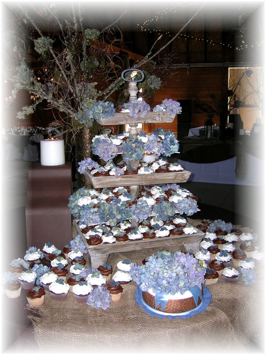 Thank you for the lovely comments! :) The cupcake tree was made of three crates with two boards in between the crates. I just took a lamp rod and ran it up the middle utilizing chair legs! LOL!! :lol: As for the hydrangea's - They are NOT real...no worries! I made them from gumpaste. Never again, I might add! :cry: Too time consuming!!