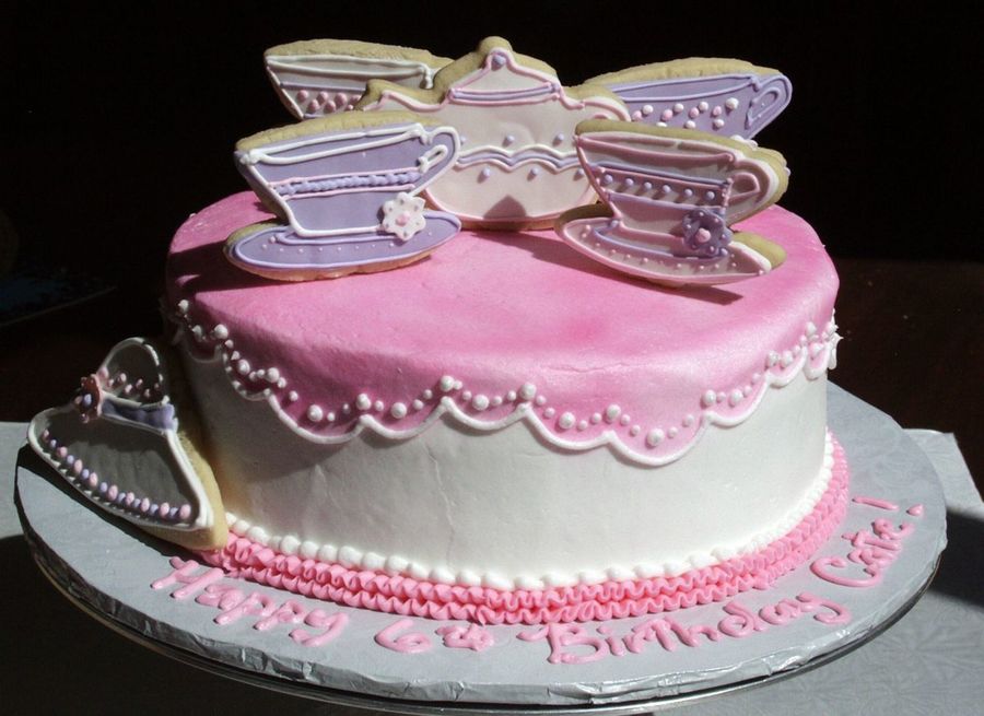 Buttercream icing with pink airbrushing for table cloth. Sugar cookies on top with Royal icing and fondant .