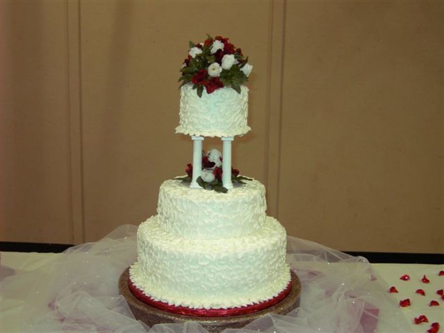 Had one week's notice for this cake. My schedule did not permit my usual attention to detail (which I TOLD the MOB). So, I "cheated" and used silk flowers. Used the cornelli lace because I thought it would add dimension to the cake.