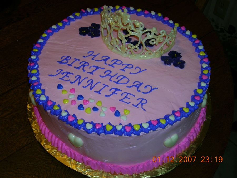 This is a WASC cake with whipped icing and strawberry filling that I made for my friends daughter for her 6th birthday today. I made the tiara with candy melts (thanks to Missyek for the template) and brushed with gold luster dust. The large hearts on the sides are also candy melts.