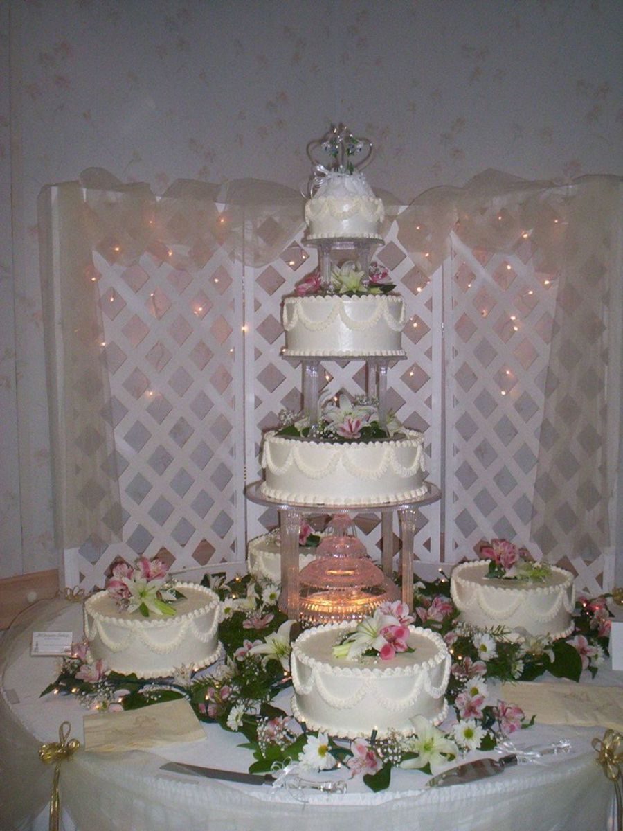 Main cake was 6"-10"-14" with four 12" satellites. Served 400 (saving top tier for 1st anniversary).
