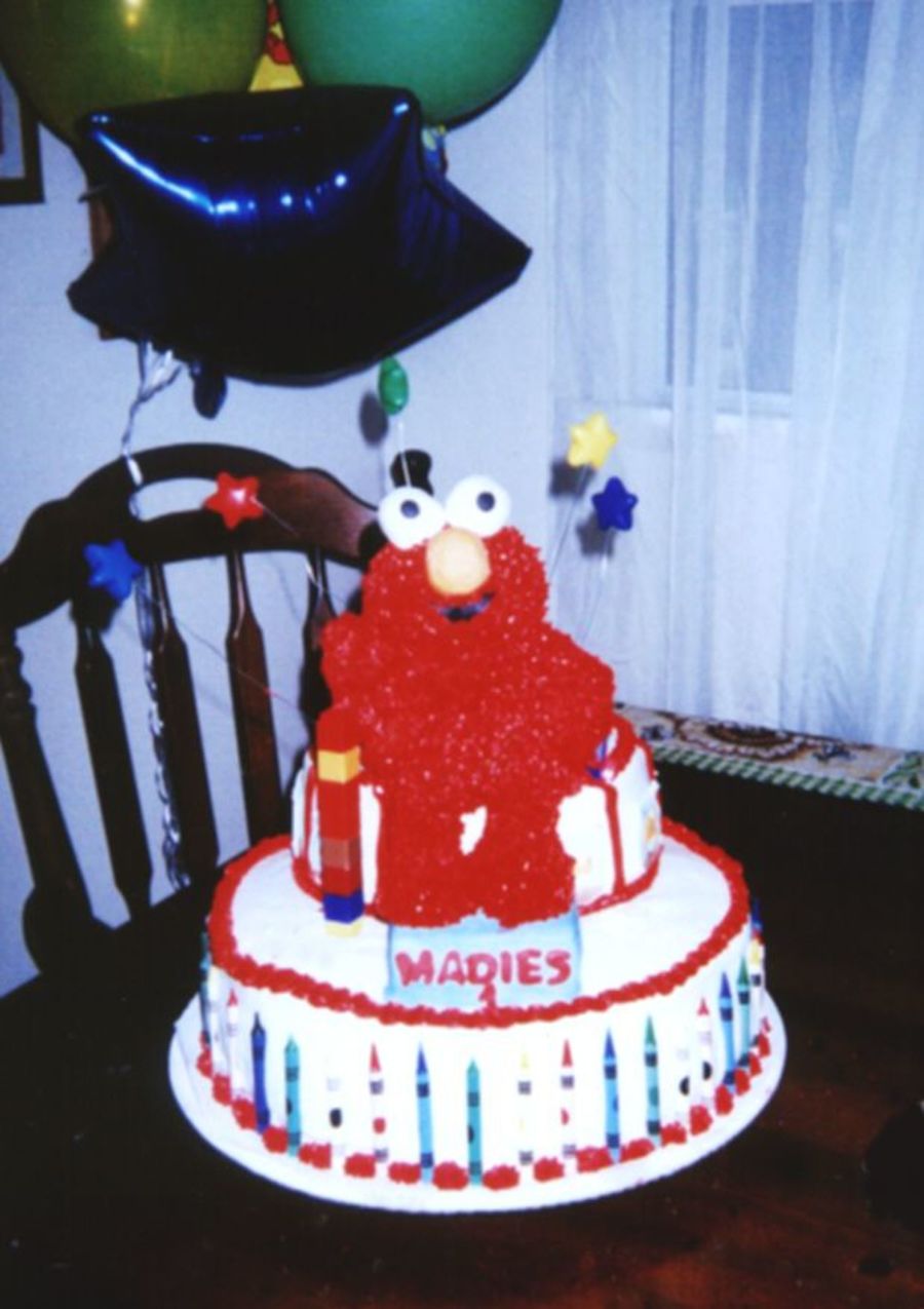 Chocolate cake, with butter cream icing, Elmo is made of rice crispy treats Had a problem with the rice crispy softening after the icing was applied (lost one arm, hence the building blocks under the elbow.