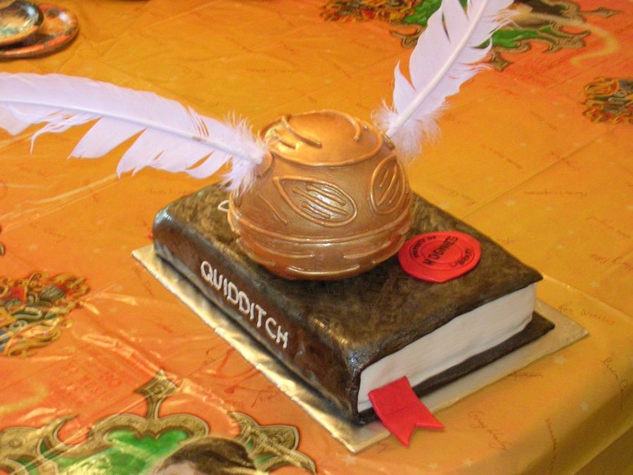 This was for my son's birthday. The golden snitch was made using the Wilton ball pan, covered in Ivory Satin Ice fondant, added fondant accents, and painted using Old Gold luster dust. The feathers are real, but I suppose you can make them with royal icing or gumpaste. The book cake details are in a separate photo.