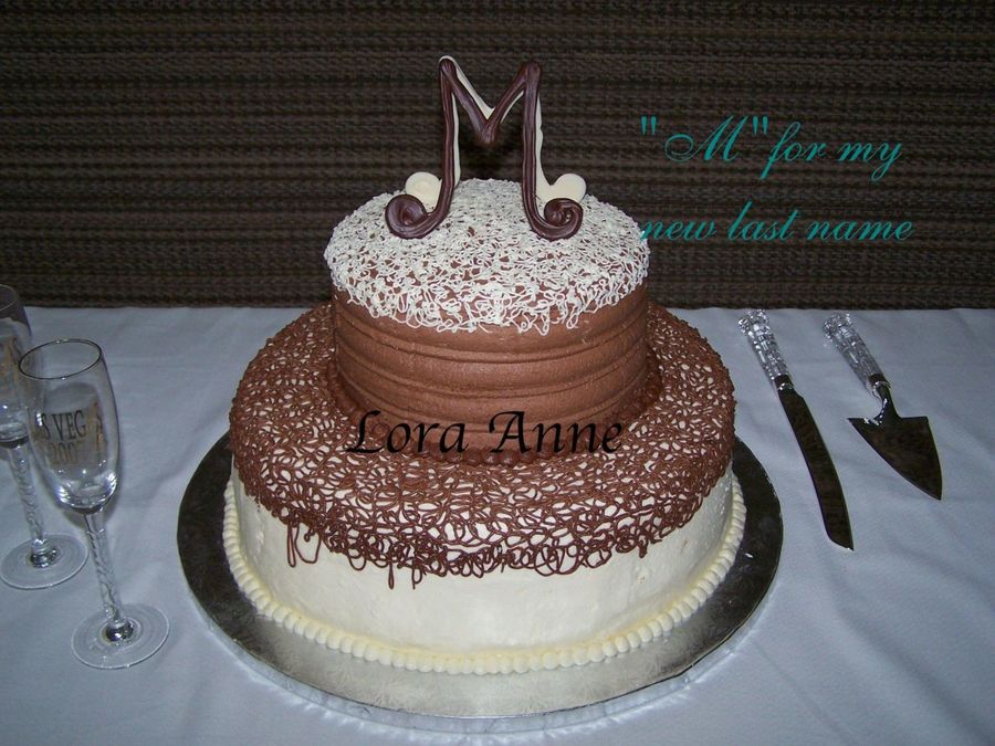 I made this with the help of my mom for wedding reception in my hometown after my husband and I got married in Vegas. (vegas theme reception cake in my gallery too). First time I did a stacked cake and it's a bit off center but yummy. White wedding cake w/ raspberry filing and almond buttercream frosting. Yellow cake with chocolate filing and chocolate buttercream frosting. M monogram on top is for my new last name, done in melted chocolate.