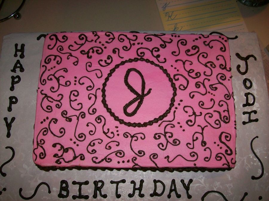Sheet cake - pink Scrollwork in brown - the girls name started with a "J: tha, therefore that is where the "J" on the cake came from.