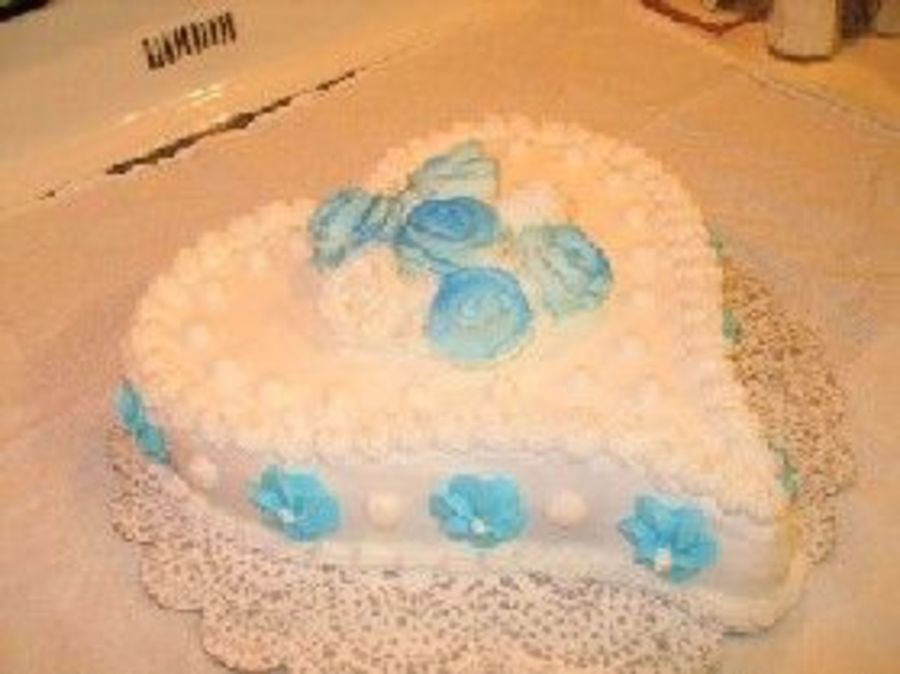 My first shaped cake, my first royal icing (blue flowers on the sides).