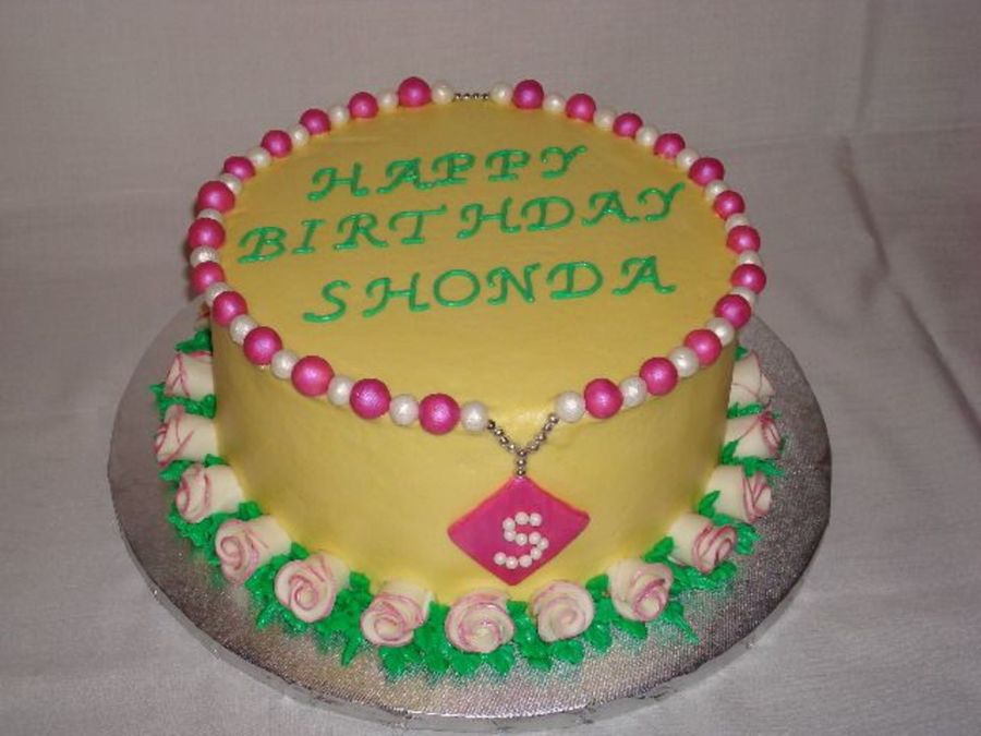Made for a co-worker's birthday. She's very "girlie" and loves jewelry so I made her a necklace. Choc cake with cookies-n-cream filling, MMF accents and buttercream icing. Fun cake to make. TFL