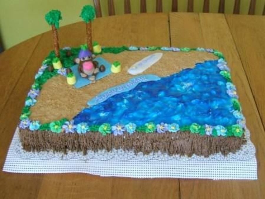 This cake was done for a 9 yr old girl, who loves Bobby Jack! Flavor is WASC cake, iced with BCD. Pretzels for the palm trees. Airhead for the surfboard. Sand is golden oreos, water is piping gel colored blue. Monkey, coconuts, pineapple, towel, Happy Birthday banner are mmf. Inspiration from CC galleries