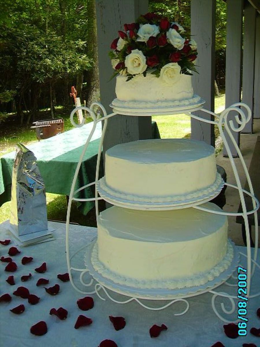 Three tier cake on a Wilton iron rack. Each layer is a different flavor: bottom, oreo; middle, orange cream; top, strawberry. Icing is Wilton buttercream recipe smoothed over frozen cakes (yes, there's no fondant!).