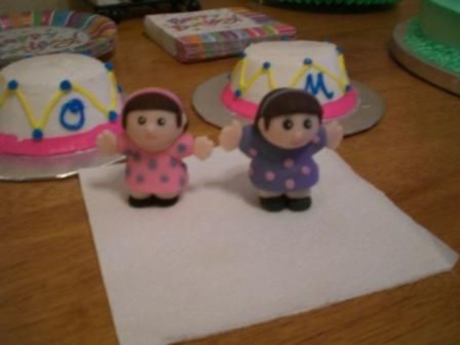 I made these "Little People" girls to go on the birthday girls' smash cakes. They are fondant. The girls (and parents) loved them but they wouldn't stand upright on the cakes...bummer. I was excited that the two-year-olds recognized that the dolls were supposed to be them!