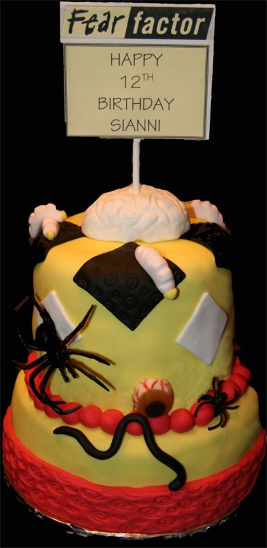 8" and 6" layers. Everything is fondant except for plastic spiders and sign. Inspired by Sandralita. Thanks for your help!!