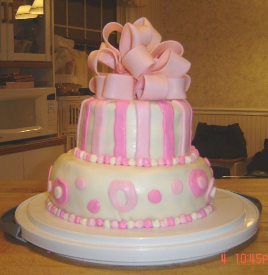 Yes, it leans a little bit. I forgot to put dowel rods in it, so i had to take it back apart and stack it again. LOL. My first attempt at a fondant bow too!!And it's really hard to get the circles to maintain their shape when trying to lift them off the mat onto the cake!