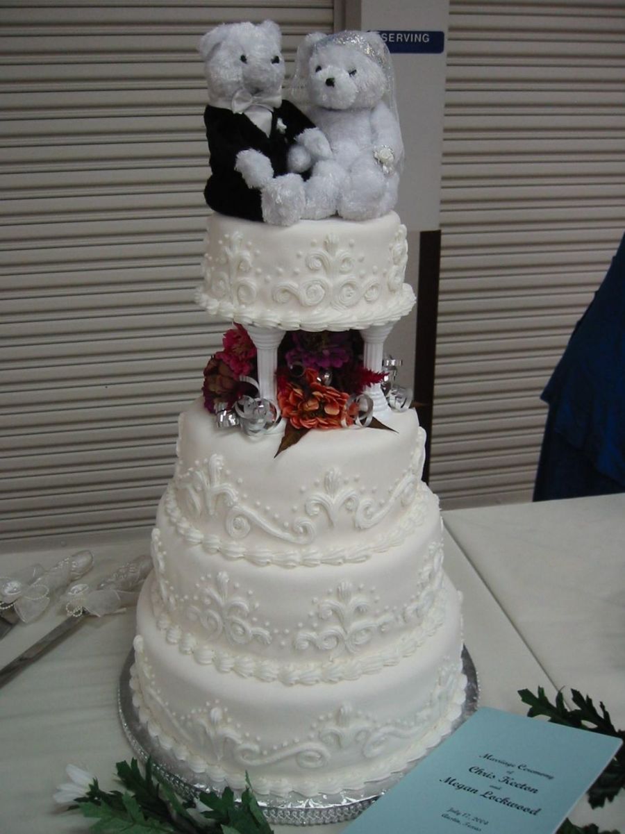 This was done for a girl who didn't want to give any impute in her wedding. Very rare!! So I did the "chunky elegant" look ... didn't know what flowers I was going to have and didn't have a topper. The night before the wedding I finally convinced her to go and buy a topper ... after the initial shock I really liked the look (added silver curling ribbon to pull it together.) In the end everyone was happy!