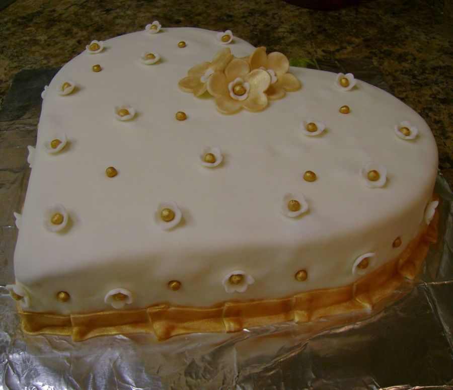 My husband bought this Wilton cake pan for me to try.Yellow cake with raspberry mousse.Covered in fondant,with fondant accents and it was my first time using gold luster dust,thats why its a little streaked.I was afraid of the shape but covering it with the fondant was pretty easy.As always,my son pushed the heart end and it shows in the picture.Thanks for looking.