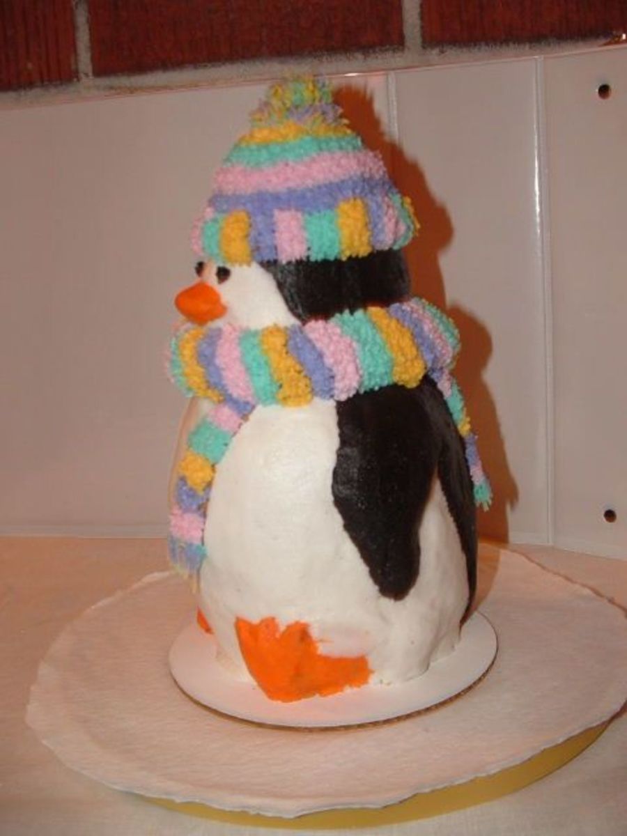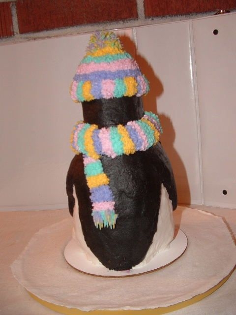 This was my first try at a penguin cake. It was a white pound cake. I baked it too long and was afraid it was going to be too dry. I also found that most penguins have black beaks and black feet. Since it was going to be part of my granddaughter's cake, I made another one the next day.