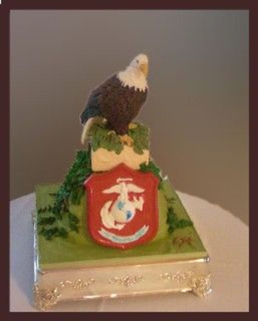 MOG ordered this cake for her son & was ready to pay for it too! She had a statue that we used as inspiration. The eagle was homemade Nicholas Lodge GP (the best!) cake was 5 layers of 10in carved into the mountain look. A large tree was on the back with branches that wrapped around to the sides. The shield was a chocolate candy mold. TFL!
