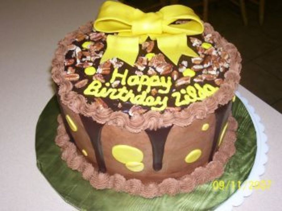 White cake, turtle filling, yellow fondant bow w/gold luster dust.