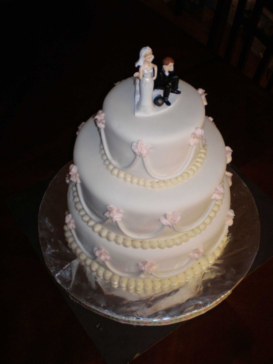 Ok so i have made cakes that look like wedding cakes but this is my first offical cake for a wedding. IT was for my cousins wedding so it was less stressful then others. Baking alone took 5-6 hours. The cake pretty much made it to the reception (in 20 minutes of traffic up and down hills), slightly stressful. The cake is vanilla marble vanilla. with vanilla chocolate vanilla buttercream. covered in satin ice. The swags are fondant and the flowers are buttercream as well as the border.