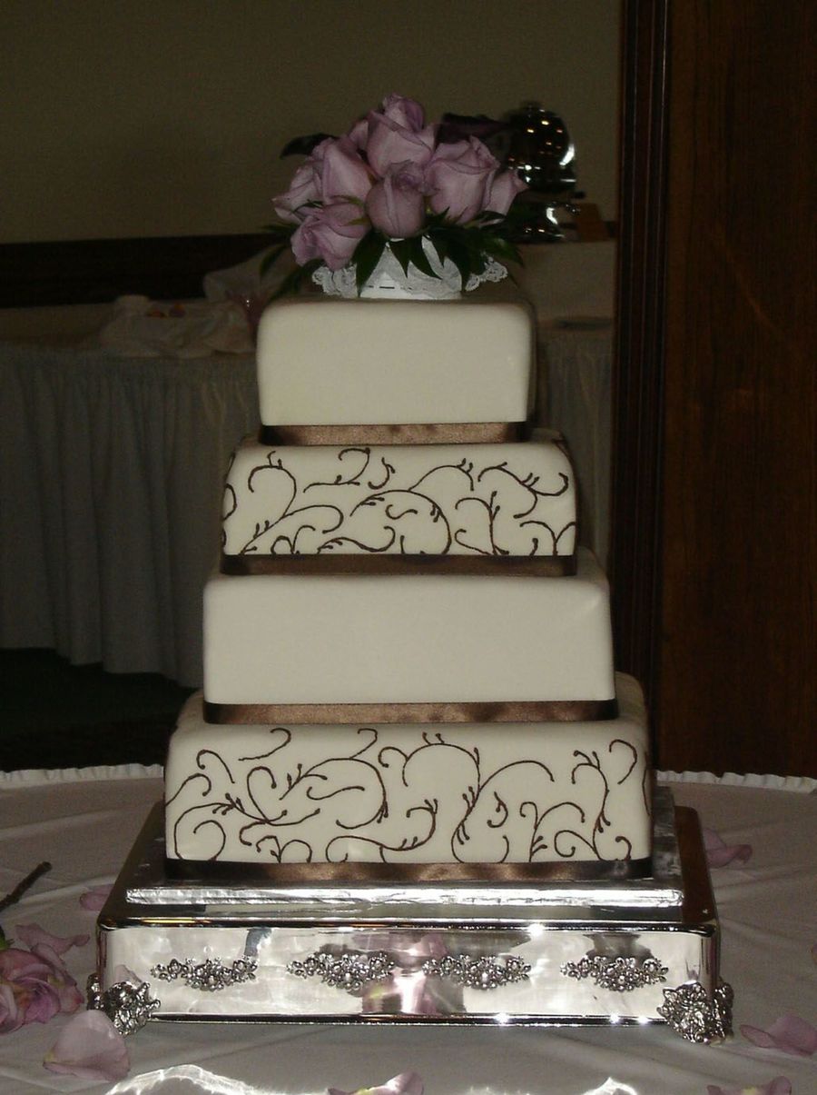 Wedding cake covered in MMF, BC scrolls, fabric ribbon and the fresh flowers were prepared by the florist. Thank you for looking.