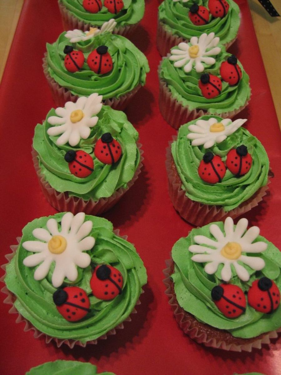 cupcakes to go with the ladybug cake. these were favors for the kids to take home. buttercream green, royal icing for the rest. cherry cake with chocolate chip "polka dots" throughout!