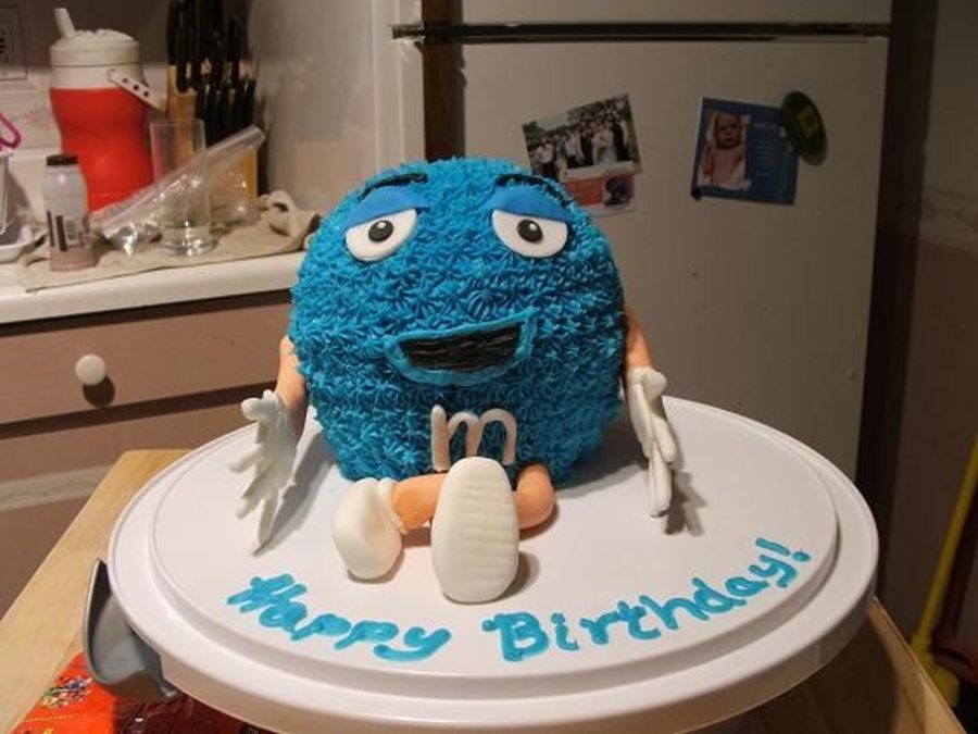 I made this out of the Wilton Sports ball pan. The branch manager at the bank where I work LOVES M&Ms so I figured it would be perfect! Yellow cake, buttercream frosting, fondant arms, legs and eyes. I also cut the letters for our manager's name out of fondant, but I didn't have them for the picture. It was a HUGE hit! The manager wouldn't let us cut it untill his wife could get a picture.