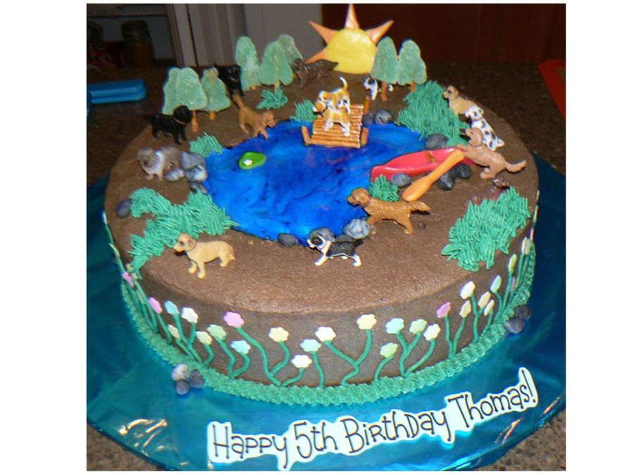 This was for a little boy who was having a dog-themed birthday party at his grandparents lake house. Canoe, paddle, lily pad and sun are made from Starburst candies. Dock, tree trunks and canoe seat are pretzel sticks. Trees are smooshed gumdrops. Rocks are fondant. Flowers on the side are just those Wilton flower shaped sprinkles. Water is tinted piping gel over buttercream. Dogs are plastic.