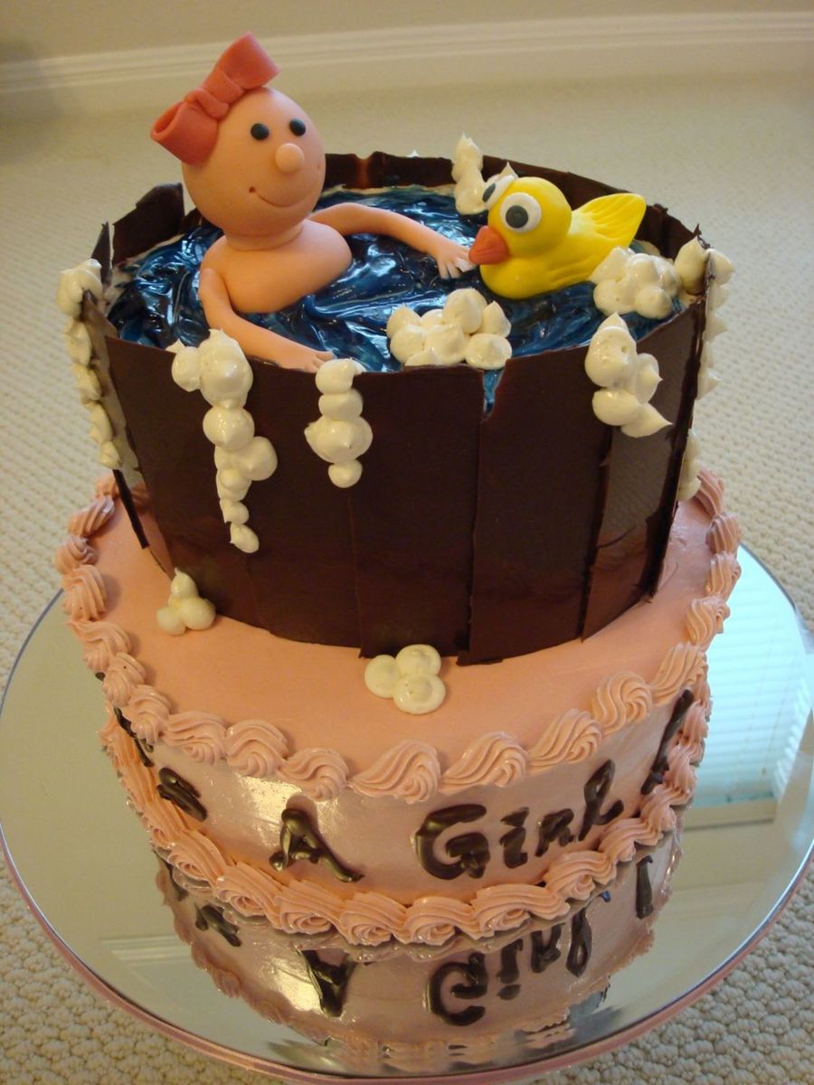 Cake covered with swiss meringue buttercream. Bucket is covered with chocolate, baby girl & duck are made from fondant. I have so much fun making this one.