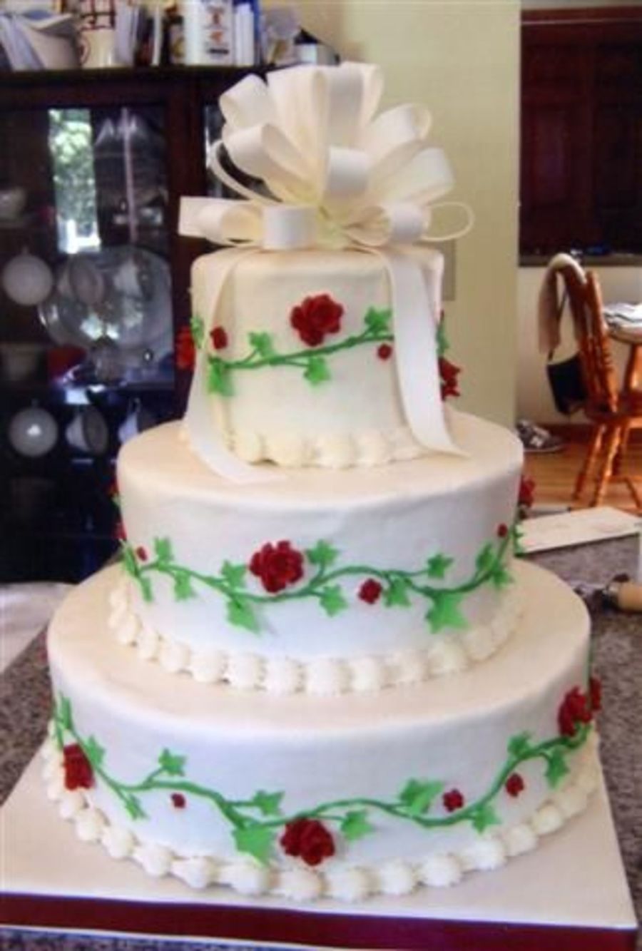 this cake was 1 layer chocolate, 1 layer vanilla with chocolate filling in each tier. The roses are molded candy clay, the ivy leaves are fondant. The bow is gum paste.
