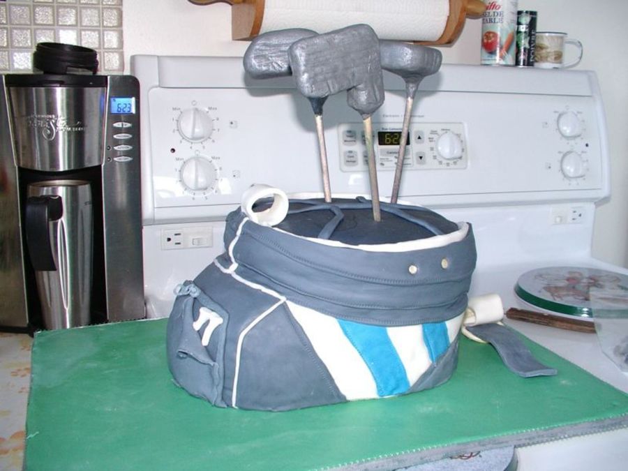 This is my attempt at a golf bag cake, all originally done by Nutellasandwiches. Thanks so much for letting me have a go at your cake! I loved the idea so much. It was made for my brothers annual work golf tournament and potluck. I had a lot of fun trying it out. It turned out pretty good for me, it was my 7th fondant cake, 3rd sculpted! All covered in fondant and gumpaste. I had a bit of trouble getting the handle to stay in place, so it ended up beside the cake..haha