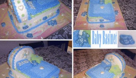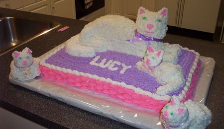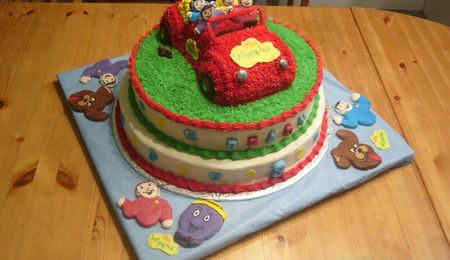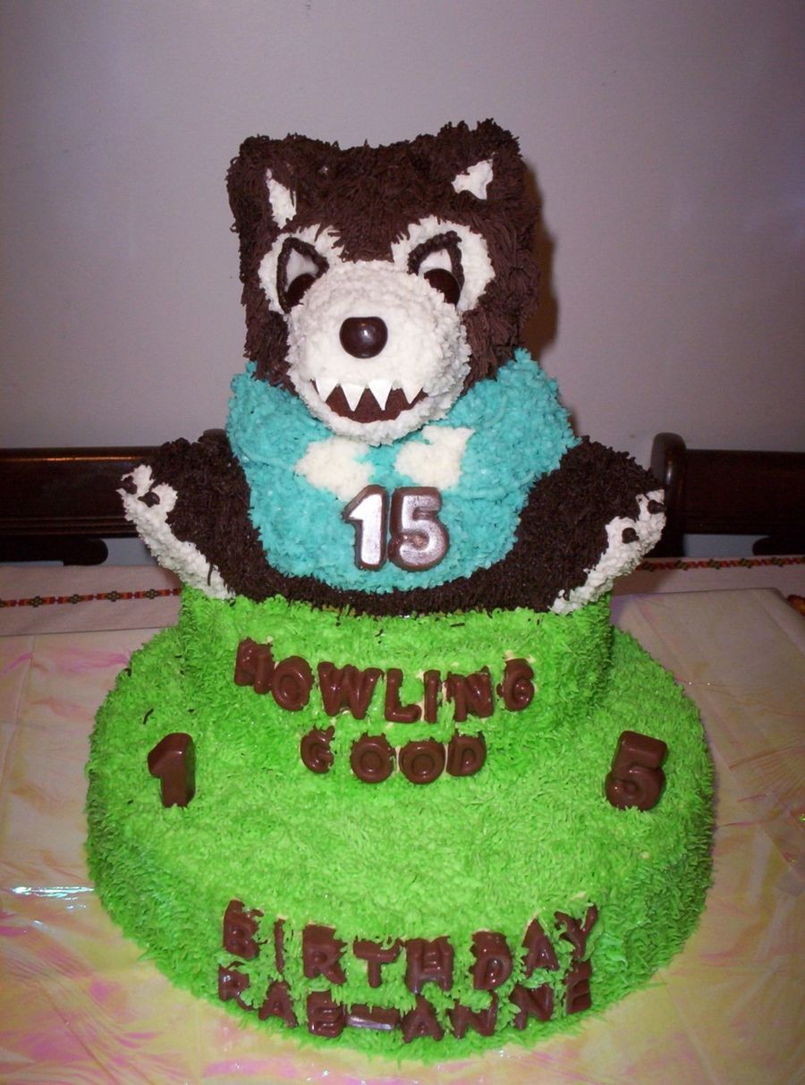 This was done with the Cuddly Bear Pan. The bottom tier is a Lemon Almond Cake with Almond Buttercream, The top tier and Wolf are ChocolateCake the second tier has Almond Buttercream and the wolf has Chocolate Buttercream and Vanilla Buttercream.The lettering is done with a Chocolate mold, the teeth are White Chocolate. My neice loved it, said it reminded her of The Big Bad Wolf in Little Red Riding Hood, her favorite tale when she was little.