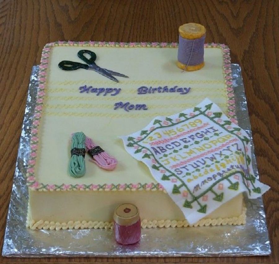 11x15- 1/2 coconut w/ pineapple filling-1/2 choc. w/ raspberry. Fondadnt/gumpaste scissors, floss, 'wooden' spool of thread, and sampler. Lettering and design on sampler in BC-fondant textured. Last min. request for canning theme to be added- mini jar of tomaoes- jar has quilted design- dusted w/ silk white to look shiney, lid dusted w/ gold and small tomato painted on top. Cross stitch border and design around lettering.