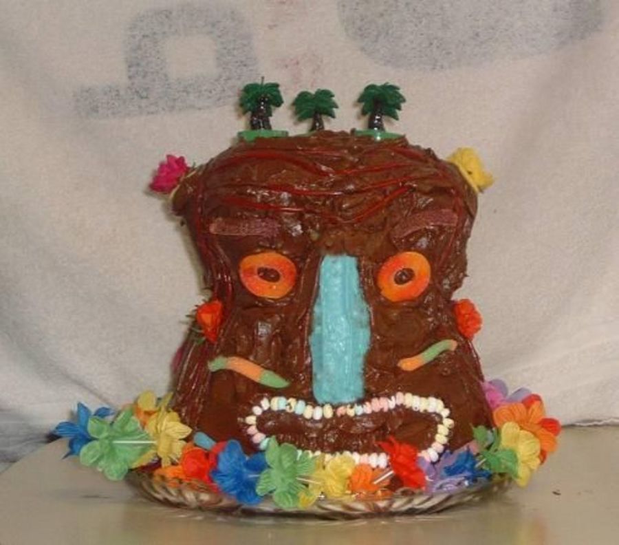 Thanks to all who sent suggestions for tiki cake. I ended up using a 9" layer and two bundt pans stacked. (top one is upside down)Decorated with candies. Thanks again to all