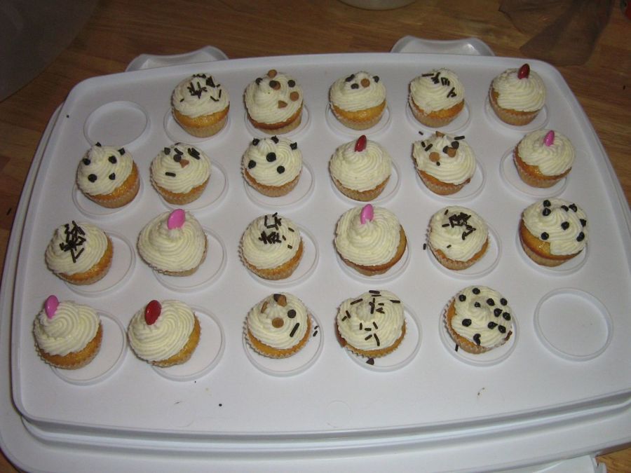 Mini cupcakes made with leftover batter from ice cream cone cupcakes. Decorated with jimmies, smarties, and choco chips.
