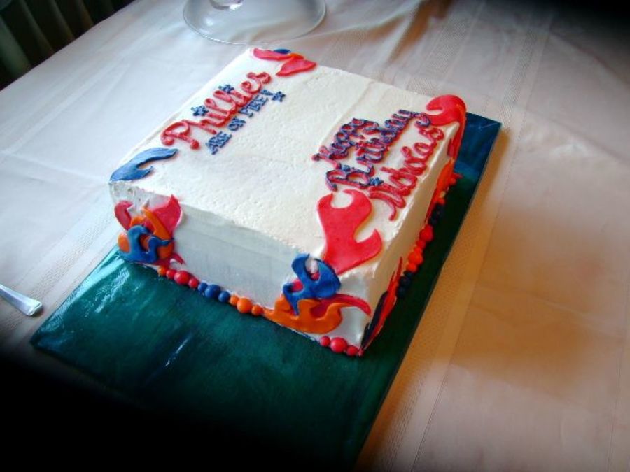 this was 1 layer chocolate w/1 layer peanutbutter cake and a reeses filling(huge hit).my son insited on flames being on his phillies cake!! flames are fondant and were so fun to make,he loved it.