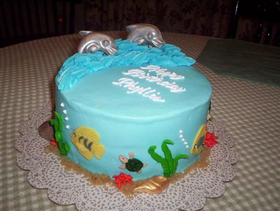 The cake is iced in buttercream. Dolphins/shells are choc. The fish I cut out of fondant. Becky Thanks for looking.