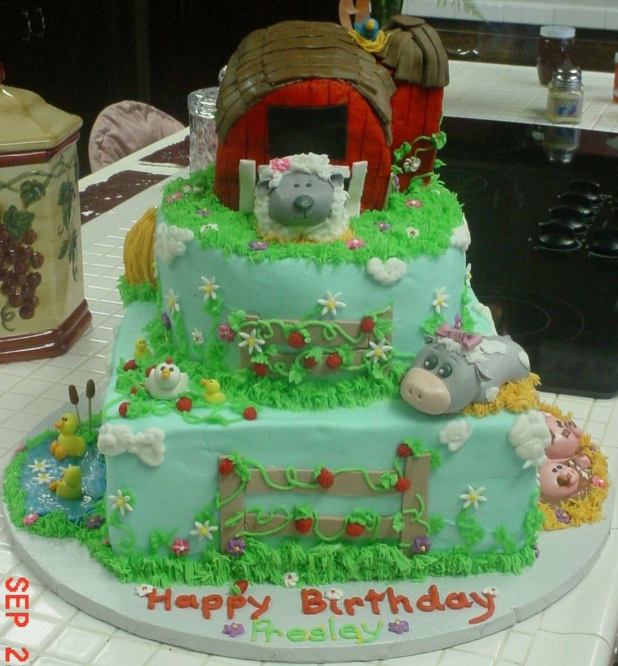 My inspiration for this cake was from brendaanne's cake and the ducks were from milliegonza. I was glad when this cake was over. It was a big cake. It was over 2 feet tall and sat on a 20"cake board. All buttercream except the fondant animals. The barn started shifting the last 15 minutes of the hour road trip. Other animals were hidden mice and and the bird in a nest on top of the barn. Other views in my photos.