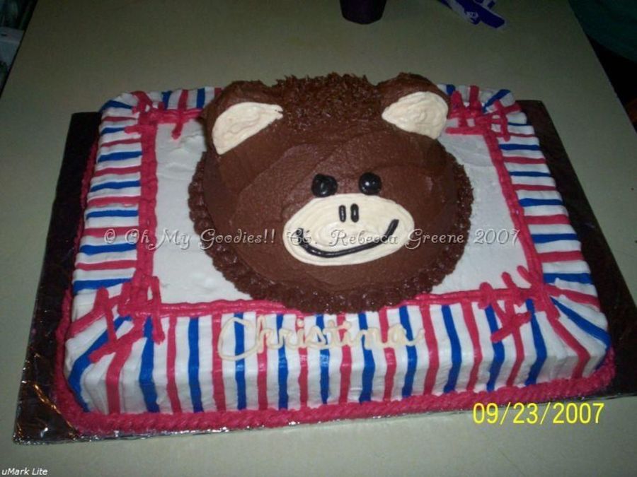 This is the cake that the cookies went with. Each child got a cookie in their goodie bag and some of the adults got one too lol. This was an 11x15" sheet cake and the betty crocker bake n fill pan for the monkey, half of a cupcake for each ear regular butter cream icing in white, pink, blue and cream, chocolate icing on the monkey and also for the black. Monkey was chocolate cake, sheet was yellow, ears were yellow. Finished this one in 2 hours including bake time lol. Everyone loved it!