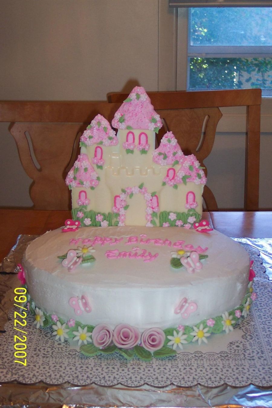This was my first attempt using MMF. I made all of the daisies, roses and leaves out of MMF. The drop flowers on the castle were Royal Icing. The castle was made out of Wilton Candy Melts. I had trouble getting my icing to stay smooth. It was very humid that day. It even cracked as you can see on the top of the cake. Ugh!!!! Thanks for looking!
