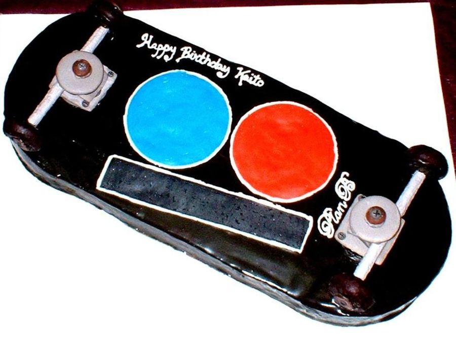 I totally loved doing this cake. It was for my friend's grandson. It is a Hersheys cocoa cake constructed with one 13X9 inch sheet and one 9 inch round cut in half. The cake is frosted with chocolate cream cheese frosting, which is then covered with black-tinted milk chocolate ganache. It is decorated with frozen cream cheese frosting transfers and royal icing lettering. The skateboard trucks are made with sugar cookies, cookie straws, milk chocolate candy melts, royal icing, and chocolate-covered donuts.