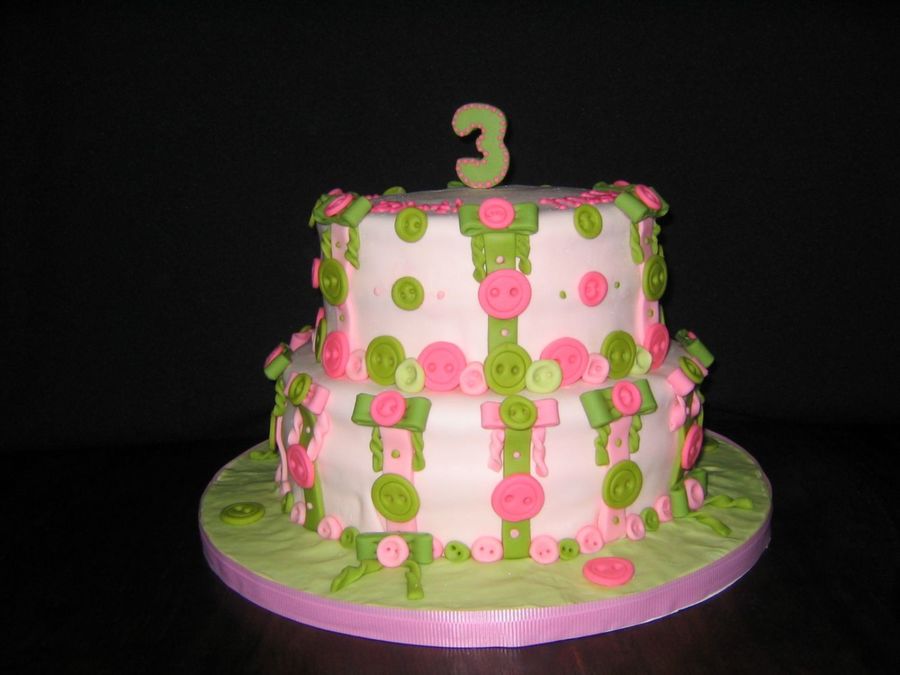 This cake was based on a design found on the web. The buttons, bows and number are all fondant.