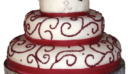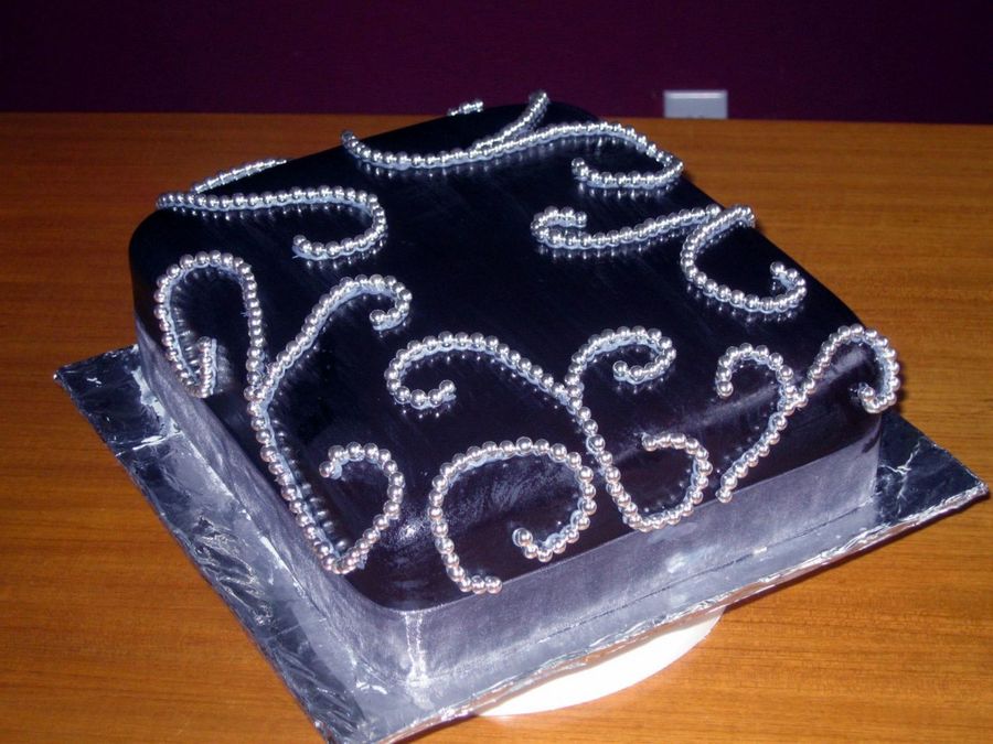 Fudgy Chocolate cake with white chocolate truffle filling. Black fondant and scrolls with silver dragees.