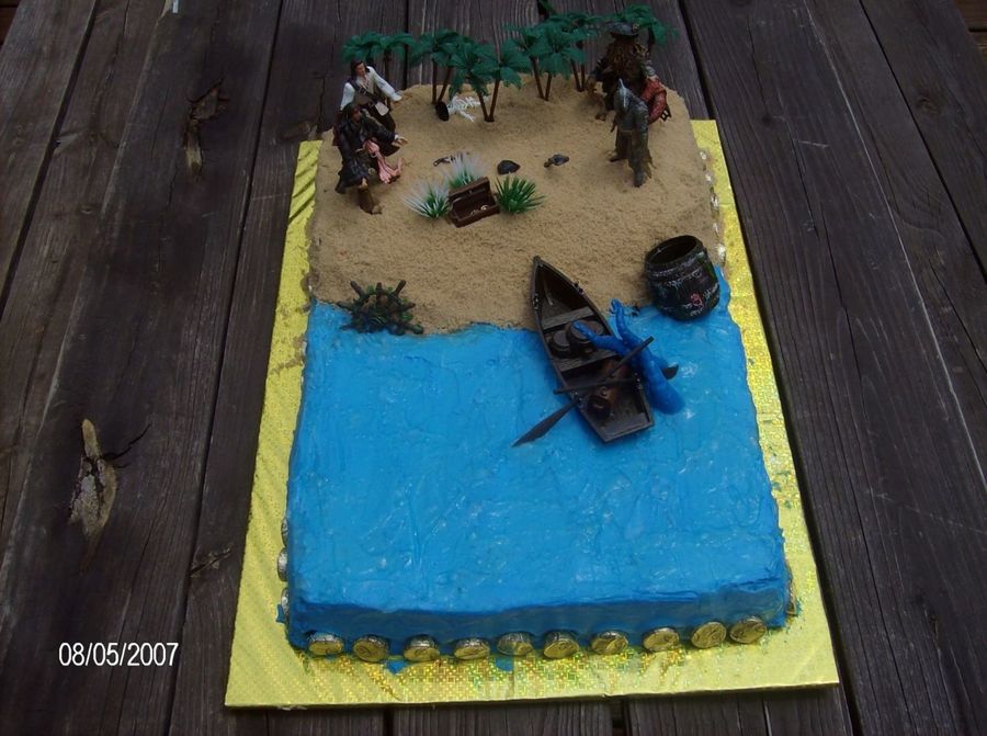 Chocolate with bubblegum flavored BC icing. Sand is light Brown sugar. Water painted with piping gel for reflective effect. Coins around base are Hersheys kisses in gold foil. Characters from Walmart. made for granddaughters 12th birthday