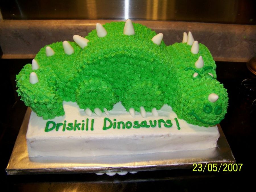 End of year party with class mascot theme. Base 11 x15. Dinosaur is made from halved 8 inch round, small doll skirt (head) and carved (tail). Buttercream icing MMF spikes, and toenails.