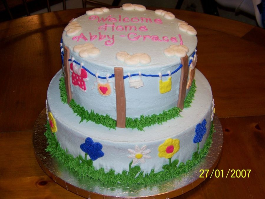 10" rounds Buttercream with some fondant accents. Piped baby clothing.