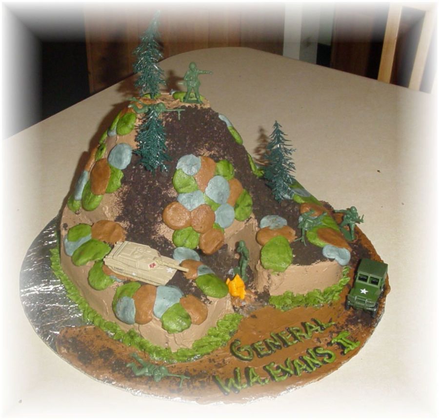 Got this idea out of a book. It was easy, and looked better in person. I added the campfire, and army men and vehicles. All frosting is BC. It was my son's 5th BDay.