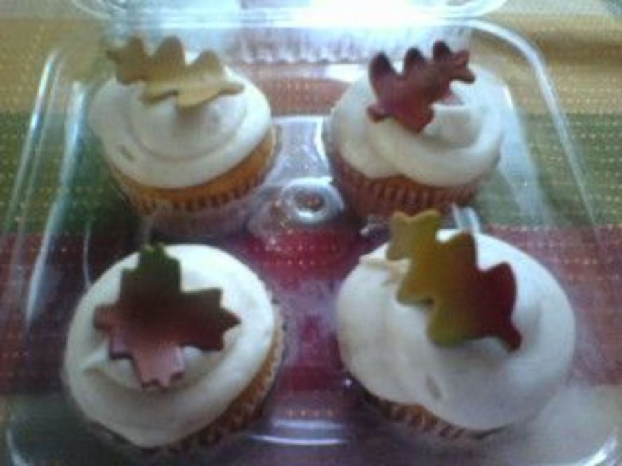 Pumpkin Pie cupcakes with Cinnamon Cream Cheese Frosting. Gum paste fall leaves