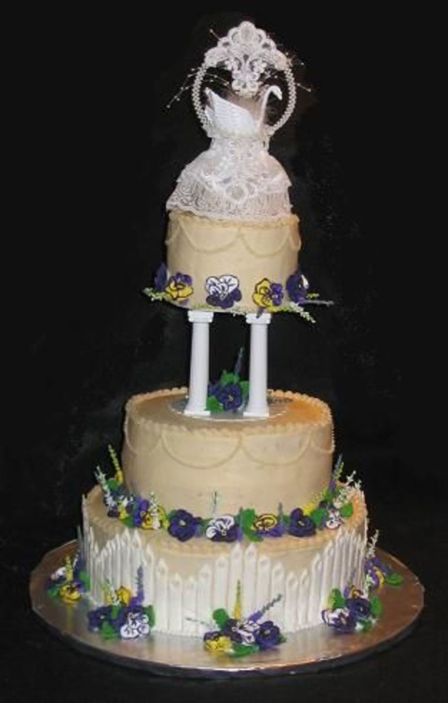 This is supposed to be an ivory cake, but it looks yellow next to the white accents. The flowers are royal icing and the fence is color flow. My first wedding cake!!!
