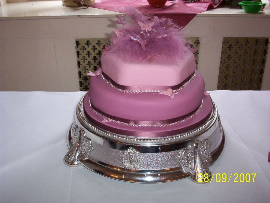 this is a round base in vanilla sponge and the top tier is hexegan in chocolate sponge the topper is butterflies and feathers as butterflies was the theme.I added diamantes to the ribbon around the cakes to set off the ribbon.