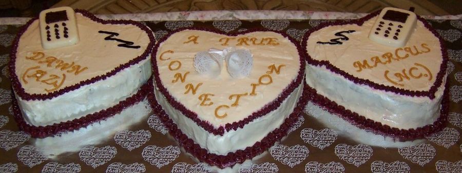 This was done for a friends sister she and this guy met on the net and well it went from distant cells to wedding bells ... the cell phones on the cake are chocolate made with the mini loaf pans.. The heat took a toll on the cake ..but they all loved it..